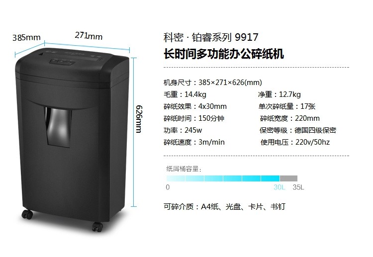 科密铂睿9917碎纸机 商用办公高保密长时间大吞吐碎文件卡光盘粉碎机