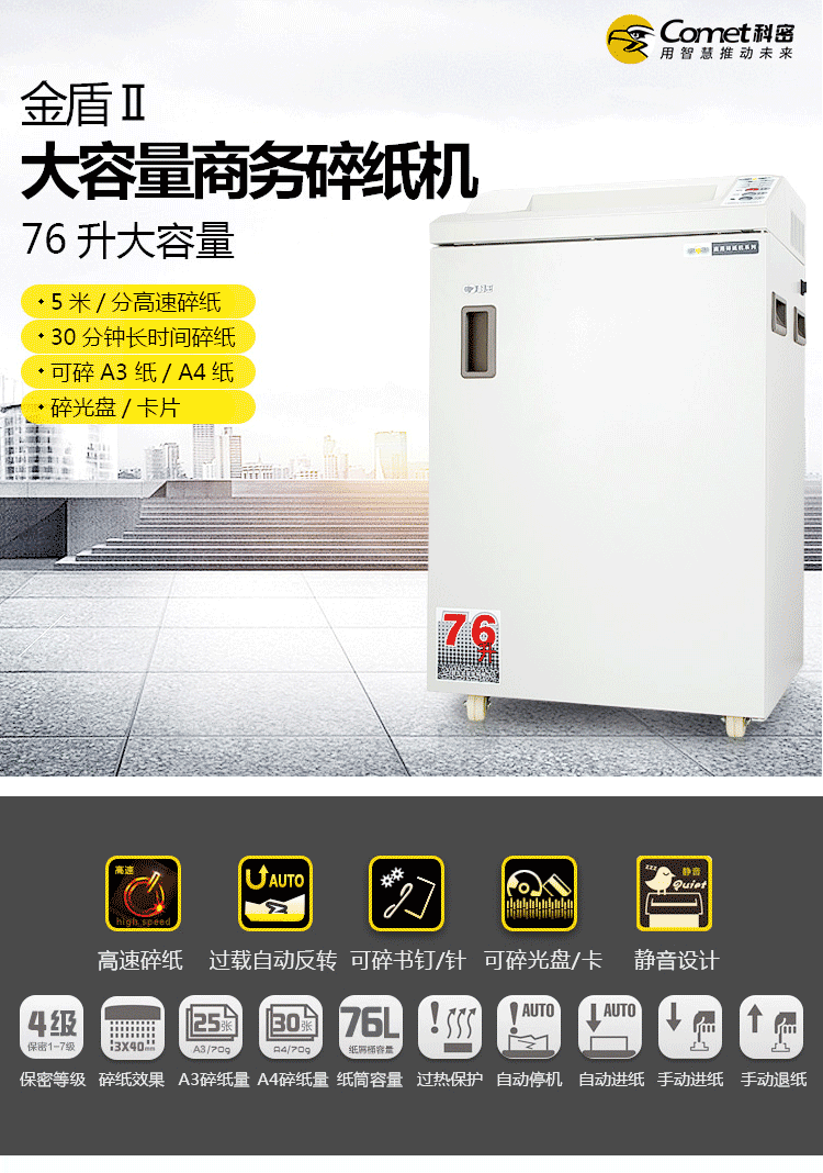 科密金盾II大型工业级碎纸机可碎A3纸76L大容量碎卡/光盘企业办公商用颗粒粉碎机