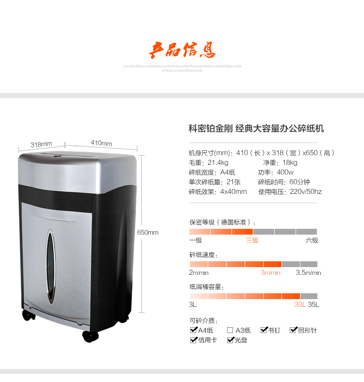 科密铂金刚碎纸机 长时间中大型商务办公用高速大容积量多功能大功率