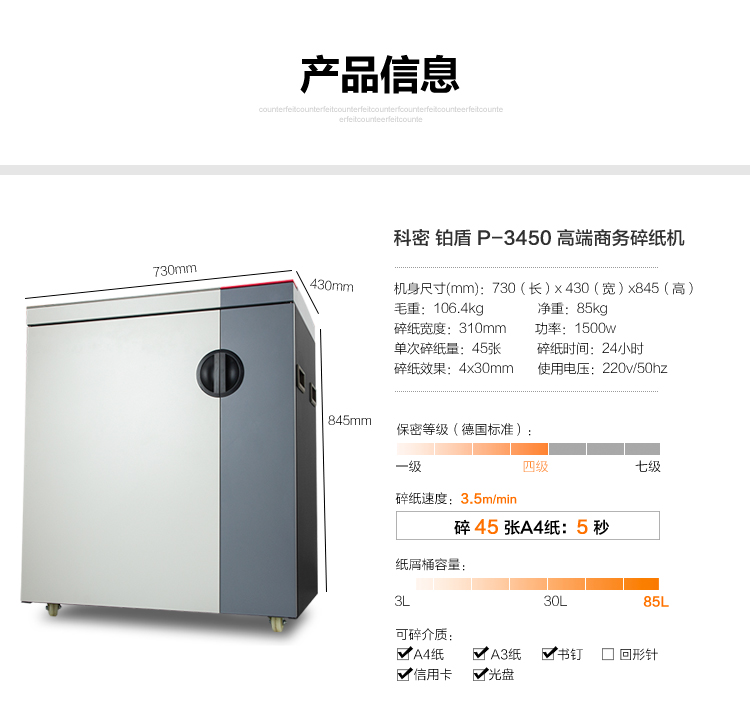 科密COMET 铂盾P-3450大型办公碎纸机A3口 24小时不停机 单次45张 85升