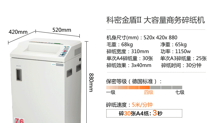 科密金盾II大型工业级碎纸机可碎A3纸76L大容量碎卡/光盘企业办公商用颗粒粉碎机
