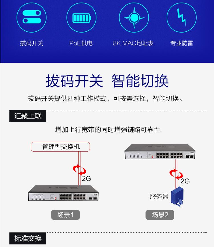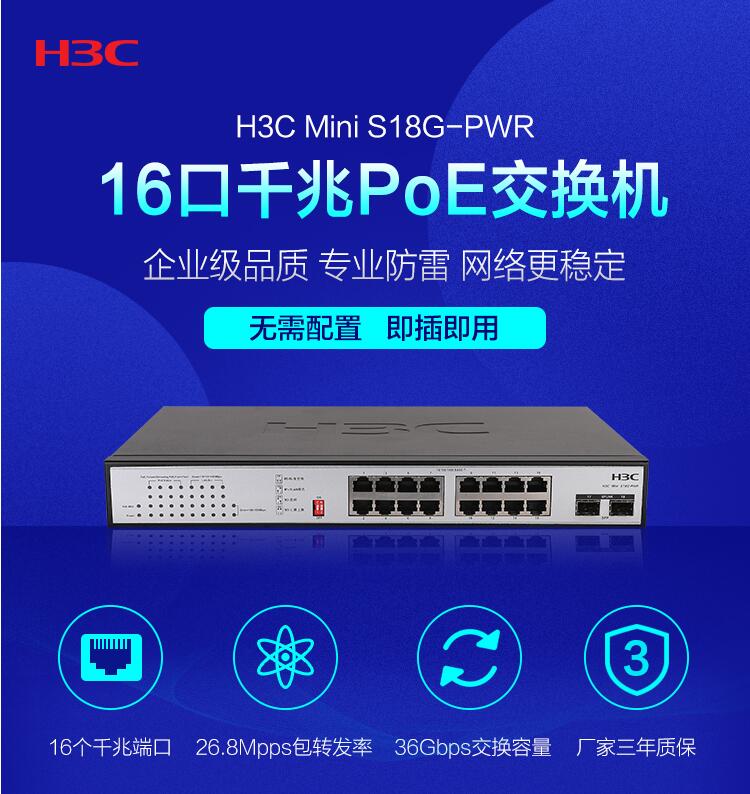H3C华三 Mini S18G-PWR 16口电+2口光全千兆非网管POE供电企业级交换机网络监控集线分流器